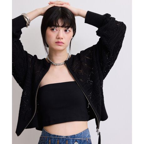 レースのような華奢な柄がフェミニンなムードを引き立てるニットブルゾン。