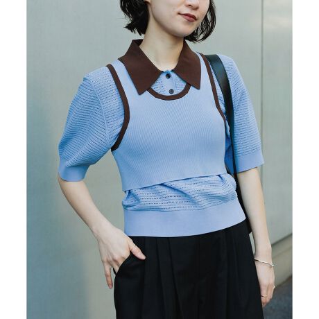 ポロシャツ:身頃は透け感のある涼しげな柄編みを採用し、袖口や裾はしっかりとしたリブでコントラストをつけたデザイン。コンパクトめなサイズ感やふわっとした絶妙なボリューム感の袖が魅力。