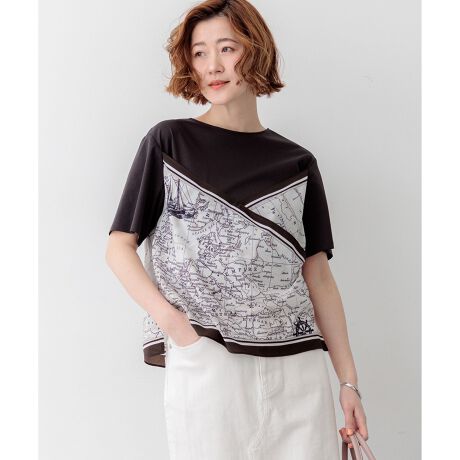 身頃には毛羽立ちを抑えた滑らかな肌触りのスムースジャージー素材を使用しています。程よい厚みがあり透けにくいため、一枚でも安心してご着用いただけます。プリント部分には、このアイテムのパターンに合わせて図案を作成した23区オリジナルのスカーフ柄を採用しており、特別感のある仕上がりです。