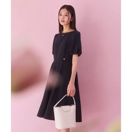 程よく立体感のあるパフスリーブは、甘さを抑え、肩まわりを柔らかく演出しています。ウエスト位置を自然にマークすることで、身体のラインを美しく整え、スカート部分は動くたびに優雅に揺れるフレアシルエットに。膝下丈のレングスがきちんと感を演出し、オン・オフ問わず活躍。淡くニュアンスのあるカラーが、肌なじみ良く、洗練された大人のフェミニンスタイルを完成させます。