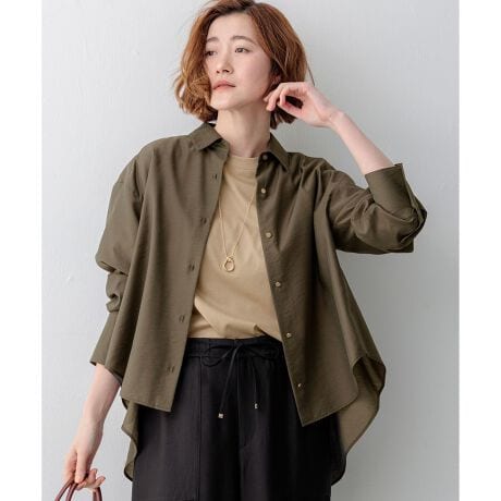 バックスタイルに施された大胆なドレープが目を引く、洗練されたデザインシャツです。前身頃はすっきりと見せつつ、後ろ身頃にはたっぷりと動きを持たせることで、360度どこから見ても美しいシルエットを叶えました。襟を少し後ろに抜いて着ていただくと、よりニュアンスのある今年らしい雰囲気が楽しめます。 ヒップラインを自然にカバーする前後差のある丈感で、細身のパンツと合わせたメリハリのあるスタイリングはもちろん、ワイドパンツと合わせたリラックス感のあるコーディネートもおすすめ。前ボタンを開ければ羽織りとしても活躍し、オンオフ問わず幅広いシーンでお使いいただけます。 カラーは、フェミニンで華やかなピンク(#012)、肌なじみが良く上品なベージュ(#033)、シックで落ち着いた印象のダークブラウン(#035)、清涼感あふれるサックスブルー(#073)、知的で引き締まるネイビー(#075)の5色展開です。