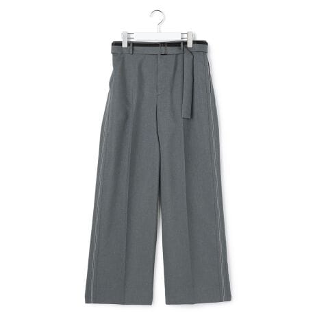 ■デザイン洗練された印象を与えるワイドストレートシルエットのパンツです。付属のサッシュベルトは、片面の上端に切り替え別布サテンを使用しています。脇にはブランドらしい縫い代を表に出したステッチディテールを施し、シンプルながらもエッジの効いたアクセントをプラスしました。同シリーズのアイテムとのセットアップ着用もおすすめです。