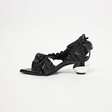 華やかなフリルと遊び心ある変形ヒールが魅力のサンダル