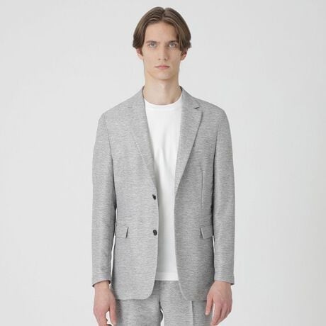 メランジ調カラーのカラミ織り素材アンコンジャケットです。肩パットや固い芯地を省き、袖裏も使用しないことで、軽さと着心地の良さを追及しました。また、肩回りのパターン設計と仕様を見直すことで、アンコン仕様でありながらも構築的かつドレッシーなシルエットに仕立てています。