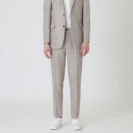 メランジ調カラーのカラミ織り素材トラウザーズ。シャープな印象を持たせる細身のシルエットながらも、ウエスト部分にはゴムシャーリングを施し快適な履き心地。ビジネスからカジュアルまで両方の用途に使用できるデザインです。