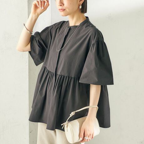 二の腕をカバーしつつ涼しく着られる五分袖のフレアスリーブがポイントで、前あきにはさりげなくコードブレードを施し、ほんのり甘さをプラスしました。