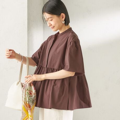 二の腕をカバーしつつ涼しく着られる五分袖のフレアスリーブがポイントで、前あきにはさりげなくコードブレードを施し、ほんのり甘さをプラスしました。
