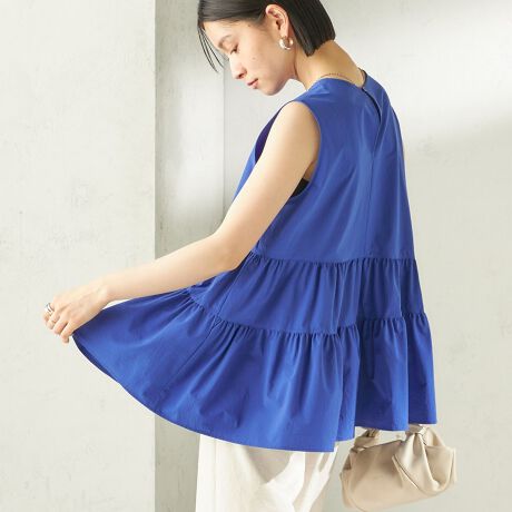 ランダムティアードが目を引くノースリーブブラウス。