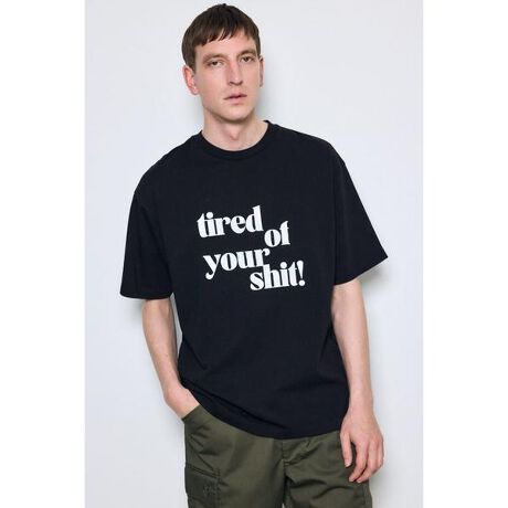 ■tired of your shit Tシャツ■ポイント「tired of your shit」のロゴを大胆に配した、メッセージ性のあるTシャツ。■ディテールシンプルな色展開でプリントが際立ち、ストリートからカジュアルまで幅広く使えます。3サイズ展開でジャストで着ていただけます。■スタイリングデニムやワイドパンツと合わせて、ルーズなストリートスタイルに。ジャケットやシャツのインナーとしてプリントを覗かせるレイヤードも◎。足元はスニーカーでラフに、ブーツで引き締めるなど雰囲気の調整も楽しめます。春夏はショーツとの相性も◎。■生地2本の糸を撚らずに並べて一緒に編み立てた引きそろえの天竺です。糸を撚り合わせず(ねじらず)に編むため、糸の中に空気が含まれやすく、ボリューム感のある仕上がりになります。32番手という「中番手」の糸を2本使うことで、一般的なTシャツよりも肉厚で透けにくく、しっかりとした安心感のある厚みがあります。透け感:なし裏 地:なし伸縮性:なし光沢感:なし※お取り扱い上のご注意プリントの位置や色、風合いには個体差がありますが、二次加工の特性です。[注意事項]※画像の商品はサンプルです。実際の商品と仕様、加工が若干異なる場合があります。※画像の商品は光の照射や角度、お使いのモニター環境により、実物と色味が異なる場合がございます。※着用、お取り扱いの際は、アテンションタグをご確認ください。
