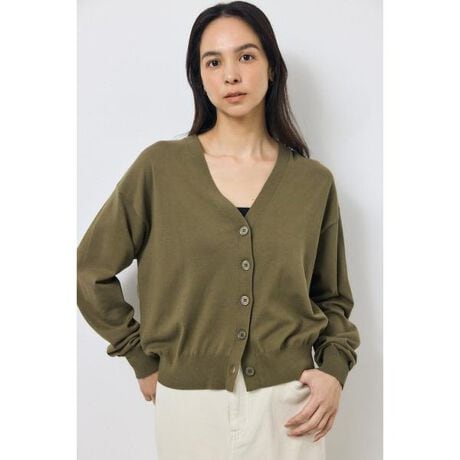 ■Vネックベーシックニットカーディガン■ポイントシンプルで着回し力の高い、Vネックベーシックニットカーディガン。すっきりとしたVネックデザインで、顔まわりをきれいに見せてくれる定番アイテムです。■ディテール柔らかく肌触りの良いニット素材を使用し、快適な着心地に仕上げています。程よい厚みで、季節の変わり目からロングシーズン活躍。ベーシックなシルエットで、インナーを選ばずバランス良く着用できます。前開き仕様のため、羽織としてもトップス感覚でも使いやすいデザインです。■スタイリングTシャツやタンクトップの上にさらっと羽織ったカジュアルスタイルはもちろん、ワンピースやブラウスと合わせたきれいめコーディネートにもおすすめ。ボタンを留めてプルオーバー風に着こなすのも◎。オンオフ問わず活躍する、ワードローブに欠かせない1枚です。■生地肌当たりの良いコットン100%の糸を使用した天竺編み素材。透け感:なし裏 地:なし伸縮性:あり光沢感:なし[注意事項]※画像の商品はサンプルです。実際の商品と仕様、加工が若干異なる場合があります。※画像の商品は光の照射や角度、お使いのモニター環境により、実物と色味が異なる場合がございます。※着用、お取り扱いの際は、アテンションタグをご確認ください。