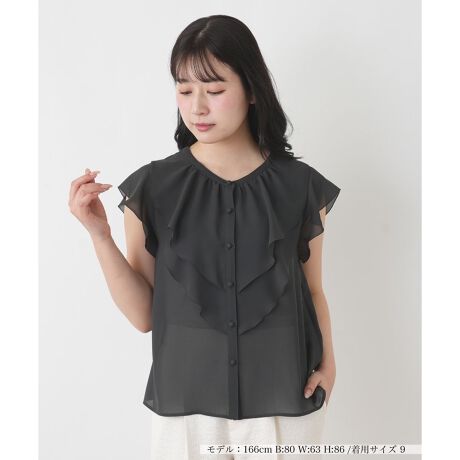 シアー感のある風合いがエレガントなムードを後押しするラッフルフリルブラウス。胸元に重ねられたフリルと肩先を優しくカバーするスリーブラインが、顔まわりを華やかに演出しつつ、女性らしい柔らかな佇まいを描き出します。フロントに並んだ小ぶりなくるみボタンがクラシカルなアクセントをプラス。日常のスタイリングから週末のお出かけまで、一枚で品のよい大人フェミニンな着こなしを叶えてくれるなトップスです。