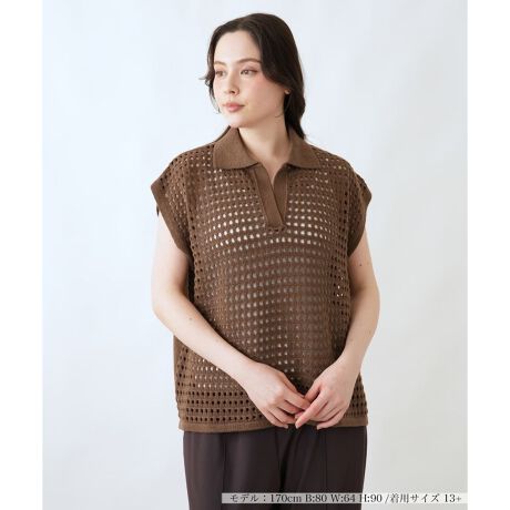 肌に優しく触れるコットンと、軽やかなアクリルを丁寧に編み上げたニットベスト。手編みのような温かみのあるざっくりとした質感が、装いにナチュラルな雰囲気を添えます。ボタンのないスキッパーデザインの襟元が、お顔周りをすっきりと見せ、大人の女性にふさわしい抜け感を演出いたします。気になる二の腕をさりげなくカバーするフレンチスリーブが、女性らしく可愛らしいシルエットを創造。ゆったりとした身幅でありながら、透かし編みの効果で重たく見えず、軽やかなレイヤードスタイルが完成します。シンプルなTシャツやブラウスに重ねるだけで、いつもの装いがぐっと新鮮に。ワンピースの上に羽織るスタイルもおすすめです。初夏のコーディネートの幅を広げてくれる、万能な一着でございます。