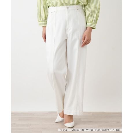 品質の高さで知られる岡山産地のホワイトデニムを使用した、大人のためのデニムパンツ。程よいゆとりのあるストレートシルエットが、脚のラインを拾いすぎず、すっきりと見せてくれます。前後中心の切り替えとステッチが縦のラインを強調し、脚長効果も期待できるデザイン。伸縮性のある素材で動きやすく、ご自宅でのお手入れも簡単なため、普段使いに最適です。きれいめなブラウスと合わせて、上品なカジュアルスタイルをお楽しみください。