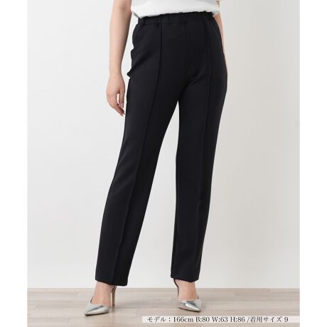 緩やかに絞り込んだようなシルエットが、スマートな大人の着こなしを叶えるテーパードパンツ。フロントからバックにかけて施された立体的なセンターシームが縦ラインを強調し、脚長見せ効果と上品な佇まいを両立させます。程よい伸縮性のあるやや薄手の生地を使用しており、動きやすく初夏でもストレスフリーで快適な穿き心地を実現。ウエストは総ゴム仕様ながらも、腰まわりがすっきりと見える緻密な設計により、タックインスタイルもバランスよく決まります。