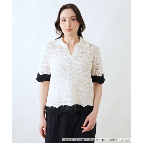 手編みのような温もりと、ざっくりとしたナチュラルな風合いが魅力のニットセーターでございます。コットンとアクリルをブレンドした編み地は、初夏にふさわしい心地よさ。全面に施された繊細な透かしレース編みが軽やかな印象を与え、キャミソールやタンクトップとの重ね着で、涼やかかつ表情豊かな着こなしをお楽しみいただけます。衿付きのスキッパーデザインがお顔周りをすっきりと見せ、大人の女性らしい抜け感を演出。裾や袖口にあしらわれたジグザグ柄の配色ラインが、レトロで愛らしいアクセントを添えます。休日のリラックスした装いにはデニムやワイドパンツと、少し改まったお席にはきれいめのスカートと合わせていただくなど、幅広いコーディネートで活躍する、大人のフェミニンスタイルを格上げする一着です。