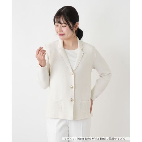 コットンのナチュラルな風合いが感じられるテーラードジャケット。シンプルなカラーリングで仕立てた編み地は程よいハリ感がありつつも、カーディガンのように柔らかな着心地を叶えてくれます。フロントに配されたエンブレムボタンが、落ち着いたトーンの生地に上品な華やかさを添えるアクセントに。すっきりとした襟元のデザインと腰まわりのパッチポケットが、大人のカジュアルスタイルに知的でクリーンな印象をプラスしてくれます。初夏のデイリーからオフィスカジュアルまで調和し、装いを品よく整えてくれる一着です。