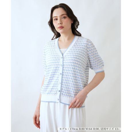 イタリアの伝統が息づく、上質なコットン素材で仕立てた涼やかでエレガントな半袖カーディガンです。まるでプリーツレースのように繊細な透かし編み模様が、上品な肌見せを叶え、幾何学的な美しさで装いを引き立てます。爽やかなボーダー柄が、タイムレスな魅力を放ち、顔色を明るく見せてくれるのも嬉しいポイント。日差しが気になる屋外での羽織りものとして、また冷房が効いた室内での体温調節にも最適です。ワンピースにさらりと羽織れば優雅な印象に。ボタンを留めてプルオーバー風にお召しいただき、ワイドパンツと合わせるのも素敵です。夏の装いに気品と深みを与えてくれる、ワードローブに備えておきたい一着でございます。
