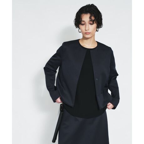 顔周りをすっきりと見せるノーカラーが大人の女性らしい上品な印象を与えるジャケットです。フロントはシンプルなスナップボタン仕様で着脱がスムーズに行え、閉じても開けてもシルエットを美しくキープします。短めの着丈はワイドパンツやロングスカートとも相性が良く、スタイルアップを叶える絶妙なバランス。上品な光沢感とハリのある素材感は、セレモニーからビジネスまで幅広いシーンに調和します。