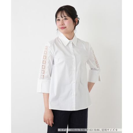袖にあしらわれた繊細なレースの切り替えが、女性らしく涼やかな印象を与える七分袖ブラウス。コットンベースのさらりとした生地を使用し、初夏にぴったりの軽やかで心地よい肌触りに。やや薄手の質感ながらもきちんと感のある襟付きのデザインが都会的な着こなしを演出。袖口の折り返しやスリットなど、細部までこだわり抜いたディテールが大人のカジュアルスタイルを上品に格上げ。一枚での着用はもちろん、羽織りとしても活躍する汎用性の高いトップスです。