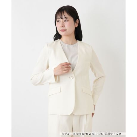 シャープなVネックのラインが顔まわりをすっきりと知的な印象に引き立てるノーカラージャケット。クリーンな色調が装いに都会的な洗練と柔らかな気品を運んでくれます。フロントに配された艶やかな貝調ボタンが、ミニマルな中にもさりげなく華やかなアクセントをプラス。袖口にはスリットが施されており、折り返して軽やかなニュアンスを楽しむことも可能です。日常のビジネスシーンからセレモニーまで、羽織るだけで佇まいを品よくモダンにクラスアップしてくれそうな一着です。
