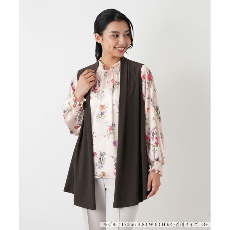 いつもの装いにプラスするだけで、ぐっとこなれた印象になる着流しのジレ。自然な前下がりのデザインと、程よくシェイプされたウエストラインが、気になる体型をカバーしつつ、美しいシルエットを演出します。伸縮性に富んだ素材を使用しており、着心地も快適。ブラウスやカットソーの上にはもちろん、ワンピースに重ねるレイヤードスタイルもおすすめです。季節を問わず長くお召しいただける、ワードローブにあると便利なアイテム。同素材のパンツと合わせてセットアップとしてもお楽しみいただけます。