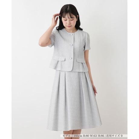 独特な凹凸感のある生地が奥行きのある表情を作り出す、ノーカラージャケットとフレアスカートのセットアップ。コンパクトな着丈のジャケットと優雅なシルエットを描くスカートが、計算されたバランスで女性らしい柔らかな佇まいを演出。フロントに並んだくるみボタンやフラップのディテールが絶妙なアクセントとなり、ブランドらしい知的なムードをプラス。単品使いでも日常のスタイルをドラマチックにクラスアップしてくれる使い勝手のよい一着です。スカートはサイドホック&ファスナー開閉、右側のみポケットがあります。