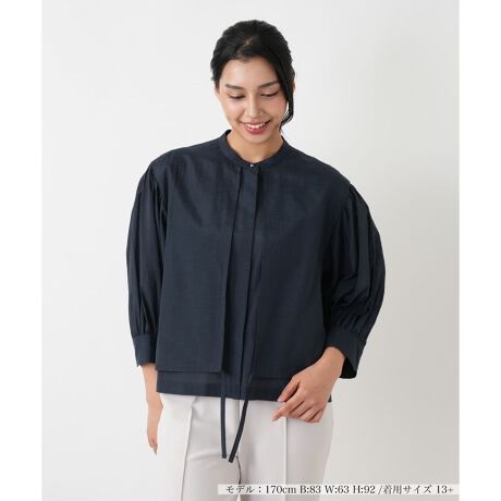 前身頃が二重になったようなデザインと、裾からのぞくドローストリングが特徴的な一枚です。紐をきゅっと絞ることでウエスト部分にギャザーが寄り、シルエットに柔らかな立体感とメリハリが生まれます。肩から寄せられた繊細なギャザーが、ふんわりとしたボリューム袖を形成し、手元を華奢に見せてくれます。すっきりとしたバンドカラーと、ボタンが隠れる比翼仕立ての前立てが、顔まわりをクリーンで知的な印象に引き立てます。
