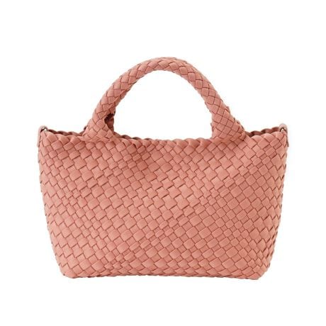 短冊状の素材を格子状に編み上げた、立体感のある豊かな表情が魅力です。光が当たることで生まれる細やかな陰影が、デザインに奥行きを与え、装いを上品に演出します。本体と一体感のあるふっくらとしたハンドルは、手に優しく馴染む持ち心地です。取り外し可能なストラップが付属しており、肩掛けや斜め掛けなど、その日の気分や服装に合わせた使い分けができます。