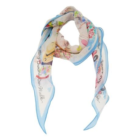 彩り豊かな手描き風のイラストが、全面に散りばめられたスカーフ。花々や軽やかなバルーン、愛らしい動物たちが織りなすメルヘンチックな世界観が、身につけるだけで顔まわりをパッと華やかに演出。透け感のある柔らかなシルクの風合いが、カジュアルな装いにも上品で洗練された印象をプラス。シンプルなカットソーやブラウスにさらりと巻くだけで、遊び心のある大人のスタイリングが完成します。