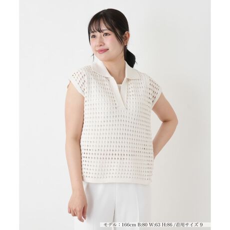 フロントに施された透かし編みが、涼やかで都会的な印象を与えるニットポロシャツ。きちんと感のある襟付きのデザインながら、ボタンレスのスキッパー仕様にすることで、大人の女性らしいリラクシーな雰囲気をプラス。肩先をカバーするフレンチスリーブで腕周りをすっきりと見せつつ、一枚で季節らしい着映えする佇まいを実現します。カジュアルなデニムからきれいめのスラックスまで合わせやすく、コーディネートを品よく格上げしてくれるアイテムです。