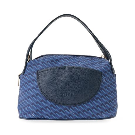 イタリア発「VISONA」の、職人技が光る上質なハンドバッグ。装いに華を添えるユニークな柄と、洗練されたフォルムが魅力です。規則的に並んだ幾何学模様のプリントと、表面にシボのある柔らかな素材の組み合わせが、モダンでありながらも上品な表情を見せます。丸みを帯びたドーム型のシルエットと、フロントの曲線的なポケットが、全体に柔らかな雰囲気を添えています。手持ち用の短いハンドルに加え、取り外し可能なストラップが付属しており、場面に応じた使い分けが可能です。上部を走るファスナーが中身をしっかりと守り、デザインのアクセントとしても機能します。