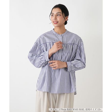 爽やかなストライプ柄が知的な印象を与える、スタンドカラーの七分袖ブラウス。すっきりとしたネックラインが、顔周りをシャープに見せてくれます。気になる腕周りをカバーしつつ、手首をのぞかせる七分袖は、細見え効果も期待できる嬉しいデザイン。一枚で着ても、ジャケットのインナーとしても様になり、オンオフ問わず活躍します。ご自宅で手軽にお手入れができるので、汗ばむ季節にも快適。清潔感と品格を兼ね備えた、大人の女性のための一枚です。
