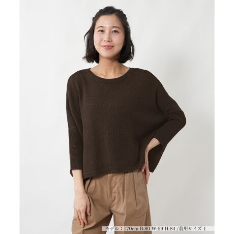 初夏の陽光に美しく映える、麻・コットン・ナイロンをブレンドしたドルマンニット。さらりとした清涼感のある肌触りと、ゆったりとしたワイドな身幅がリラクシーで都会的な抜け感を演出します。手首が覗くドルマンスリーブが全体を軽やかに見せ、動きに合わせて生まれる優雅なドレープが女性らしい柔らかなシルエットを形成。背面に配されたシルバーボタンがアクセントとなり、前後を逆にしても着用できる2WAY仕様で多彩なアレンジが楽しめます。
