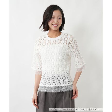 繊細な模様を編み出した総レースが女性らしい可憐な華やぎを添えるクルーネックカットソー。透明感のある初夏の光に美しく映え、肌を優しく透かすような表情が着た際に柔らかな佇まいを演出。肘まで届く程度の五分袖のラインは気になる二の腕をスマートにカバーしつつ、端正で知的なニュアンスをプラス。細部までこだわり抜いたディテールが相俟って、洗練されたムードを醸し出す大人顔のトップスです。