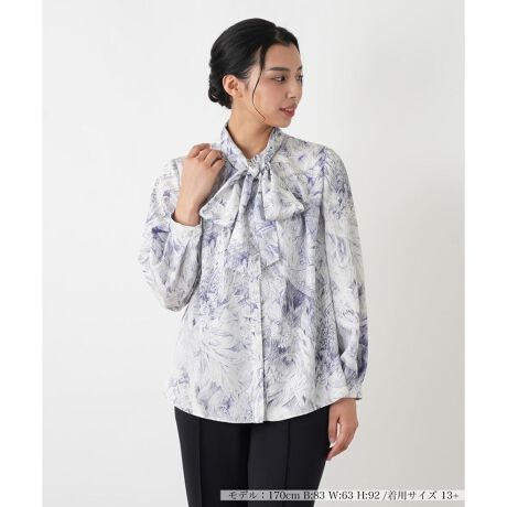 イタリアの名門「ERICA」社のアーカイブから選び抜かれた、繊細な線描きのボタニカルプリントが美しいブラウス。なめらかな風合いと上品な光沢感が、プリントのエレガントさを一層引き立てます。すっきりとしたスタンドカラーにボウタイが付属しており、結び方次第で様々な表情を演出できます。一枚で着て主役に、ジャケットのインナーとして華やかさを添えても素敵です。ご自宅でお手入れ可能な手軽さも魅力で、日々のワードローブを豊かに彩る一着です。
