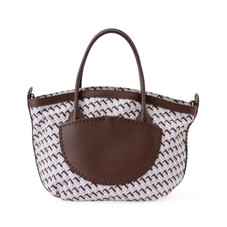イタリアのファクトリーブランド「VISONA」より、コーディネートの主役となる美しいハンドバッグが届きました。リズミカルな幾何学模様の生地が、装いにモダンで軽快なアクセントを加えます。ハンドルやフロントの曲線的なポケットには、表面にシボのある柔らかな素材を組み合わせ、デザインに奥行きを与えています。本体上部の波形にカットされたカッティングが、さりげない遊び心を添え、全体の印象を柔らかく見せています。取り外しと長さの調節が可能なストラップが付属しており、手持ちはもちろん肩掛けでもお使いいただけます。