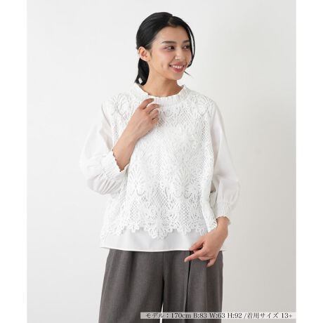 質感の異なるレースと無地素材を巧みに組み合わせた、プルオーバータイプのブラウス。身頃を二枚重ねにすることでレースの立体感が際立ち、奥行きのある豊かな表情を生み出します。衿元と袖口にあしらわれたシャーリングが、デザインのアクセントに。2種類の高級感あふれるレースを使用しており、シンプルなボトムスに合わせるだけで、一気に華やかな装いが完成します。デニムと合わせてカジュアルダウンしても素敵な、大人の遊び心を満たす一着です。