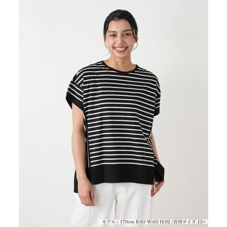 夏の装いを爽やかに彩る、ボーダー柄のフレンチスリーブカットソー。肩先を優しくカバーするフレンチスリーブが、気になる二の腕をすっきりと見せ、上品な印象を与えます。一枚で着ても、カーディガンやジャケットのインナーとしても活躍する、着回し力の高いアイテムです。ご自宅でお手入れしやすい素材なので、汗ばむ季節にもぴったり。デニムと合わせてカジュアルに、きれいめのスカートと合わせてフェミニンにと、様々な着こなしをお楽しみください。