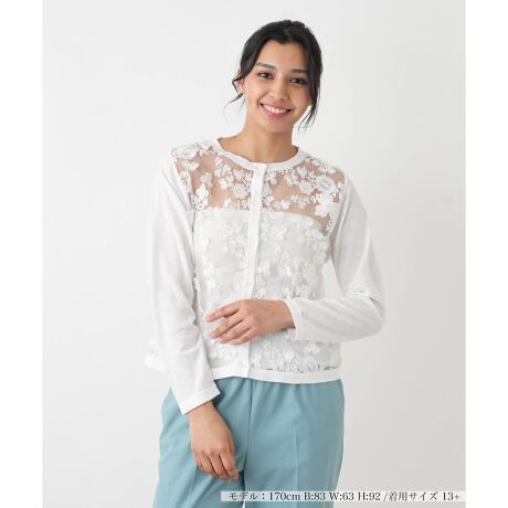 前身頃から背中にかけて、繊細な花の刺繍が施された透け感のある生地を重ね、華やかな印象に仕上げました。立体感のある刺繍が、肌の上で美しく浮かび上がり、装いに奥行きを与えます。袖や後ろ身頃は滑らかな質感の生地で切り替えることで、異素材の組み合わせが洗練された表情を演出。すっきりとしたクルーネックとフロントに並んだ小ぶりのボタンが、上品なアクセントとして全体を引き締めます。