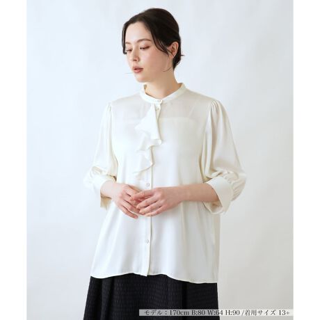 片側に流れるようにあしらわれたフリルが、顔まわりに優雅でアシンメトリーな表情を添えます。肩からふんわりと膨らむ袖は、袖口できゅっと絞ることで立体的なシルエットを生み出し、手元を上品に演出します。すっきりとしたスタンドカラーが、フリルの甘さを抑え、全体を知的な印象に引き締めます。滑らかな落ち感のある生地が、身体の動きに合わせてしなやかなドレープを描く一枚です。