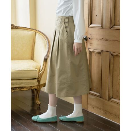 ウエストに施されたタックが美しいAラインシルエットを演出し、動くたびに上品な広がりを見せます。