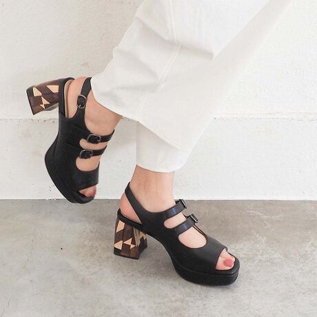 幾何学柄のスタックヒールが目を惹く、