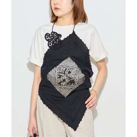 レーススカーフを斜めに巻いたようなホルターネックのキャミソールブラウスに仕上げました。