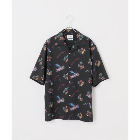 南国を思わせる手描きタッチのイラスト柄を全体に散りばめた、雰囲気たっぷりのアロハシャツ。