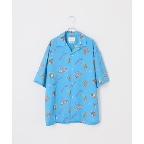 南国を思わせる手描きタッチのイラスト柄を全体に散りばめた、雰囲気たっぷりのアロハシャツ。