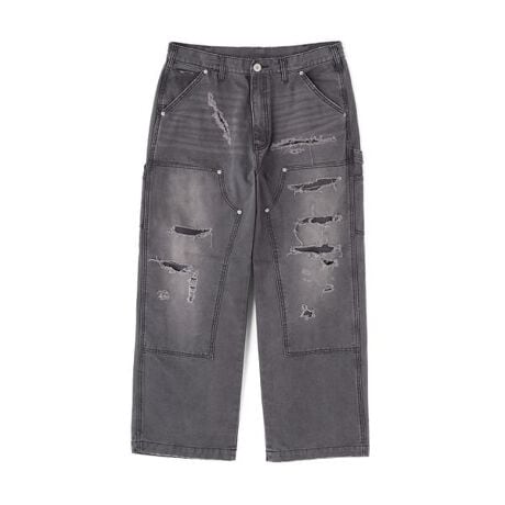 膝部分に補強パネルを施したダブルニー仕様に加え、ヴィンテージライクなウォッシュ加工とダメージ加工を施すことでシンプルなトップスと合わせるだけでも存在感のあるスタイリングに。