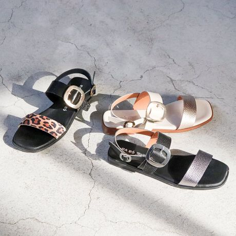 配色で魅せるフラットサンダル。