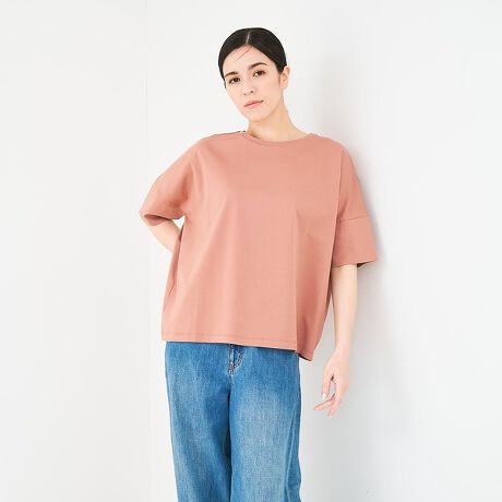 体のラインを拾わないゆとりのあるシルエットながらも、丈は短めなのでルーズにならず、バランスが良いデザインです。
