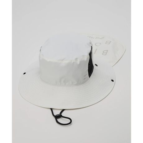 ビーチやアウトドアで活躍するビーチハット。撥水加工を施したポリエステル素材で、サイドパネルの一部には通気性を確保するメッシュ素材を使用しています。内側のライナーにも同素材を採用しました。首周りの日焼けを防ぐサンシェードは取り外しが可能で、内側には接触冷感加工を施しました。風が強い日でも安心して着用できるループストラップを搭載。サンシェードには同色系のCLEANプリントを、フロントの左サイドにワンポイントでウェーブロゴプリントを施しました。