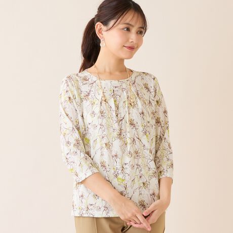 襟ぐりのタックがアクセントになっており、肘が隠れる袖丈も嬉しいポイント。